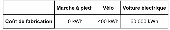 Concernant le projet objectif 3000 kWh, je voulais montrer qu’en marchant nous utilisions moins d’énergie qu’en conduisant une voiture. Je me suis finalement rendu compte que ce n'était pas si évident*. J'ai donc revu ma copie et je me suis posé une question plus générale : Est-il envisageable de se déplacer en voiture avec un quota annuel de 3000 kWh par habitant ? Après quelques recherches j’ai trouvé que pour produire une voiture électrique nous utilisions 60 000 kWh** soit 20 fois plus que le quota annuel. Imaginez, il faudrait économiser plus de 20 ans de salaire énergétique pour s'acheter une voiture ... Par comparaison, aujourd'hui il nous faut économiser 2 ans de salaire. Cela signifie que, demain, sans pétrole, une voiture devrai coûter 10 fois plus cher, soit le prix d'une maison***. Un simple calcul d’ordre de grandeur nous montre que dans quelques années la voiture sera un moyen de transport réservé aux personnes très riches. Il est donc idiot de vouloir développer ce marché pour les personnes qui ne le sont pas … Malheureusement, à l'heure actuelle, les constructeurs automobiles développent le marché de la voiture électrique en faisant croire que c'est une stratégie d'avenir viable, ce qui, en l'état de la recherche actuelle, est un gros gros mensonge (non-démenti par les gouvernements actuels). C'est de l'énergie perdue qui pourrait servir à développer de nouveaux moyens de transport moins énergivores. J'ai donc une question adressée à l’équipe des pauvres, des personnes aisées et des riches : Avant que nos enfants et petits enfants n'aient d'autre choix que de se déplacer à pied car nos ressources auront été inutilement épuisées, quelle est notre stratégie pour aboutir à un monde sans voiture ?