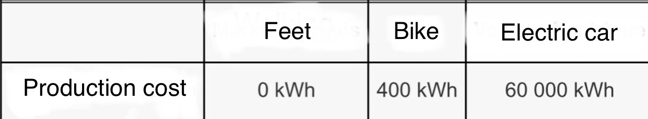 Concerning the project "Towards 3000 kWh", I wanted to show that we where using less energy by walking than by driving a car. In the end it was not so obvious* and thus I and asked the question differently : Is it realistic to drive a car when having energetic quota of 3000 kWh per year ? After some research I found that we needed to use 60 000 kWh** to build an electric car, which is 20 times more the annual quota. Imagine saving 20 years of energetic salary ty buy a car ... By comparison, today one need to save 2 years of salary. This means that tomorrow, without petrol, a car should be at least 10 times more expensive and cost the price of a house***. A simple calculation shows that in a few years cars will be only accessible to very rich people. Thus, for the ones who are not very rich, this a nonesense to develop the car market. Today, the market for electric cars is expanding. Car constructors argue that electric cars are a reliable alternative for the futur and governements seem to buy it. The truth is that developping such a market is a waste of energy that could be used to develop transportations alternatives that are les energy consuming. Based on this conclusion, I have a question adresses to the team of the poor, middle classe and rich people : Before our children have no choice but walking because we have wasted all our ressources on stupid choices, what is our strategy to end up in a world without cars ?